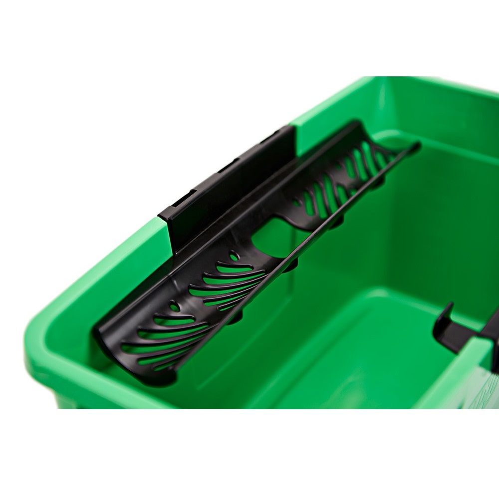 Bu 12 litrelik kova şık olduğu kadar pratiktir. Unger imzalı yeşil renkli kova, siyah saplı şık tasarıma sahip kompakt, dikdörtgen şekli, alanı optimize ederken temel temizlik malzemeleriniz için geniş alan sağlar.